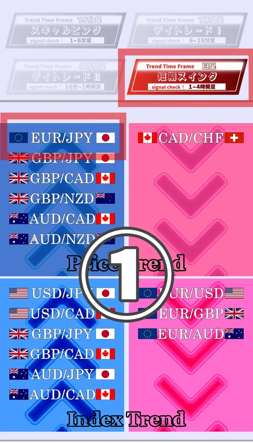 今、強いトレンドが出ている通貨ペアが一覧で表示されます。