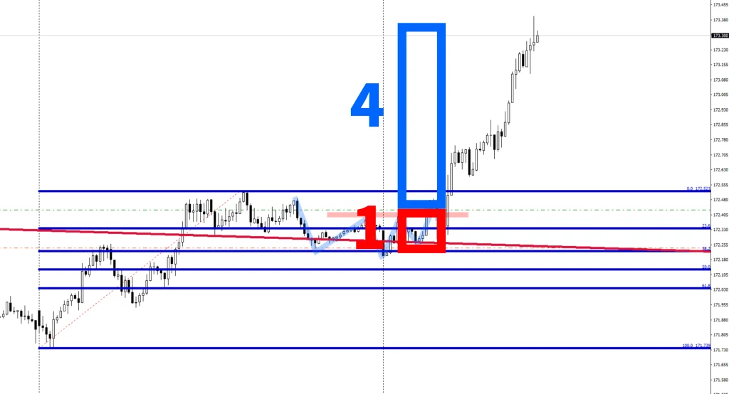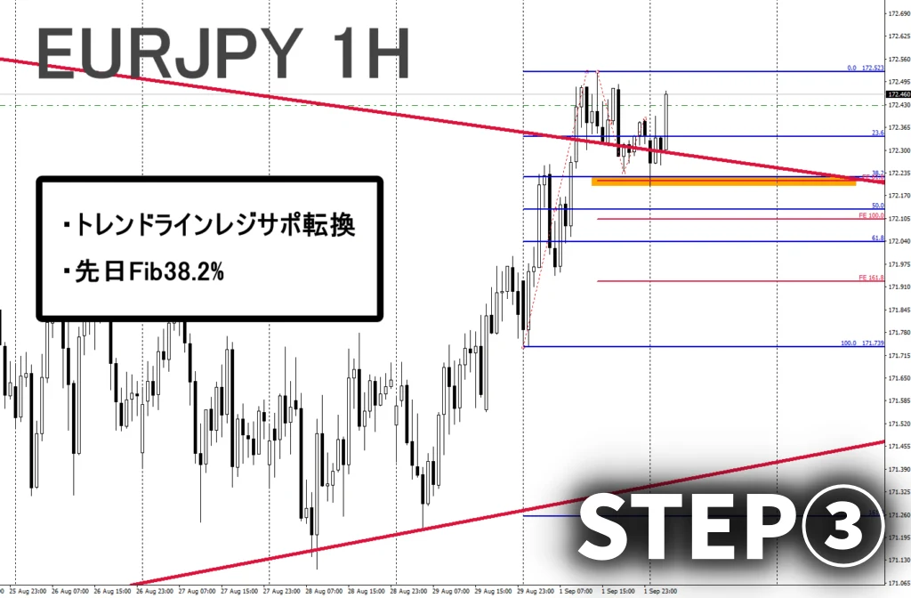 ②さらに、先日のFib38.2%と、フィボナッチエクスパンション61.8%が重複して、ディナポリ手法のアグリーメントが成立している。
