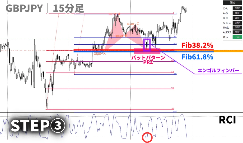 今回のエントリーで、もっとも強力な根拠となったのが、エントリーポイントがバットパターンの PRZ(ポテンシャルリバーサルゾーン) と一致していたことです。